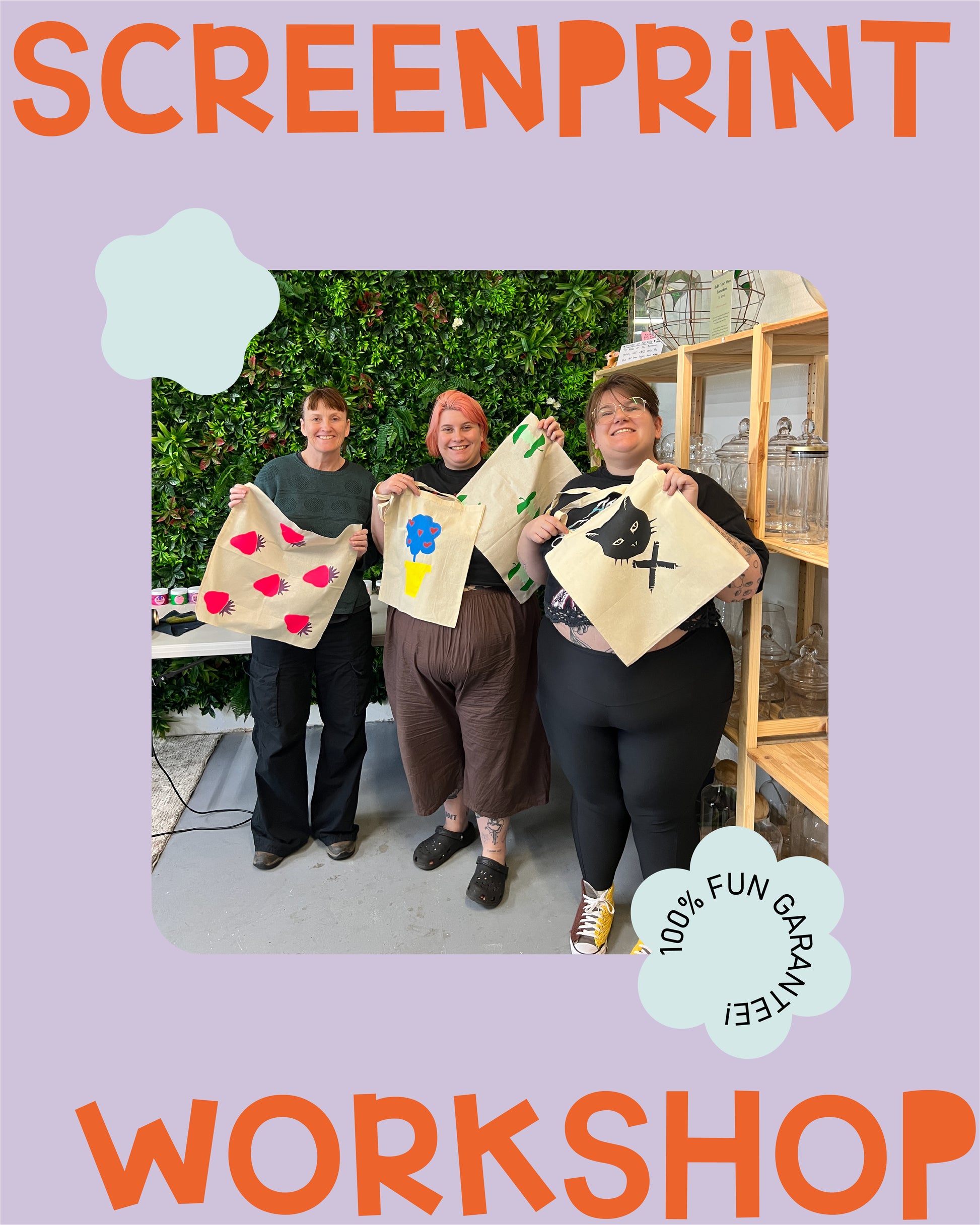Everything you need to start screen printing — eco-friendly black ink, a screen, a squeegee, a tote bag, knife, pencil, tape, wooden sticks and a printed step-by-step guidance as well as a link to the youtube tutorial